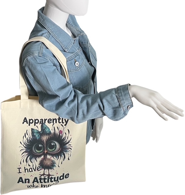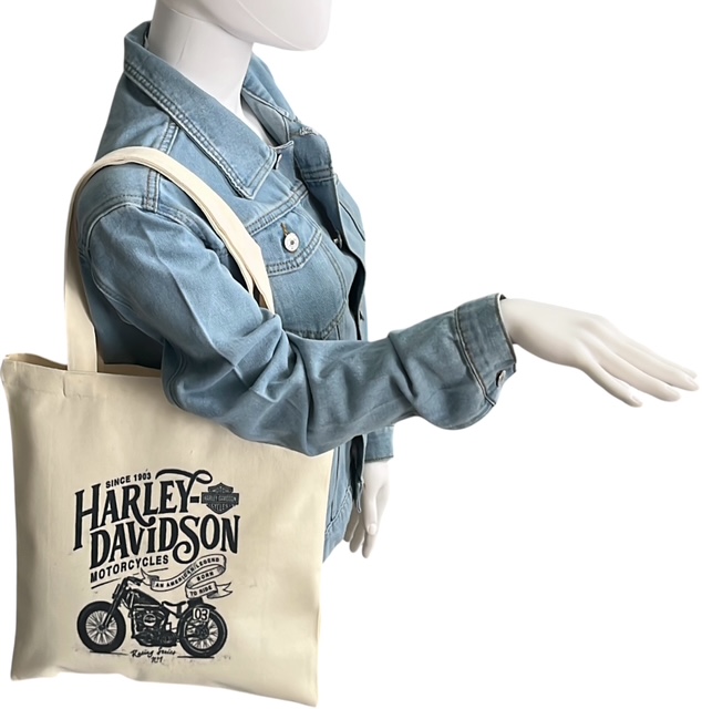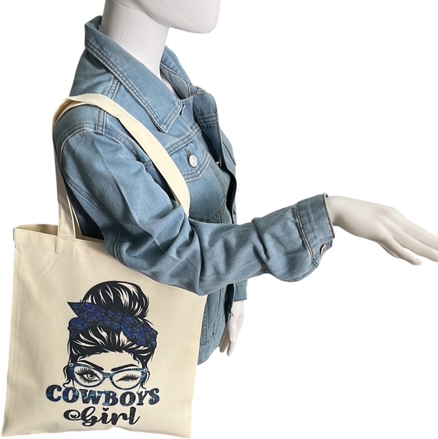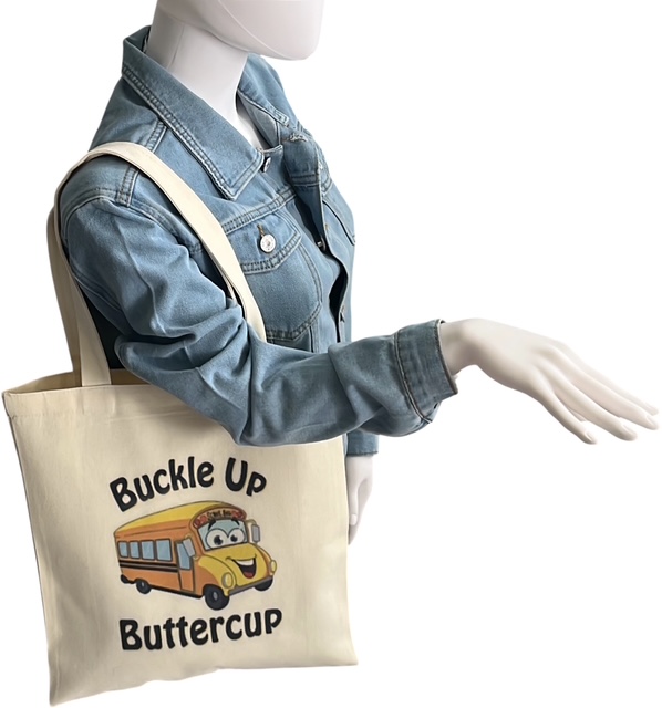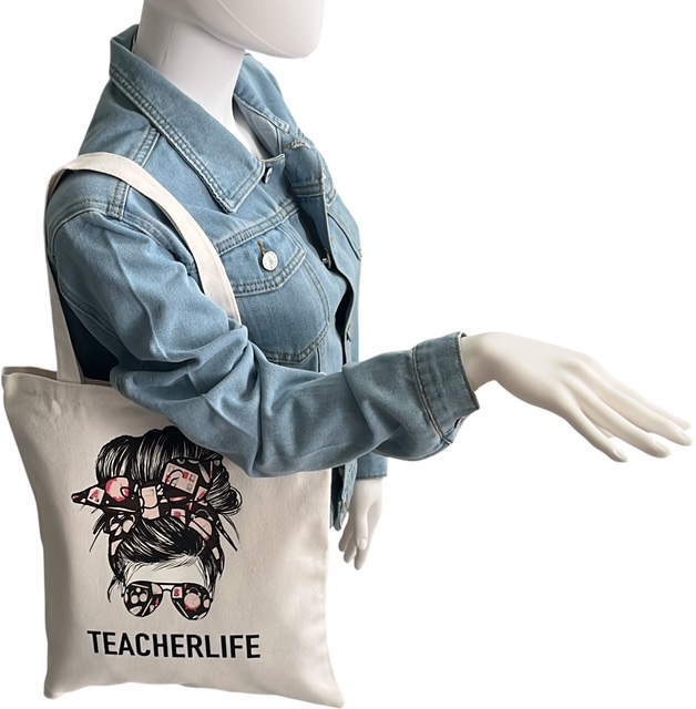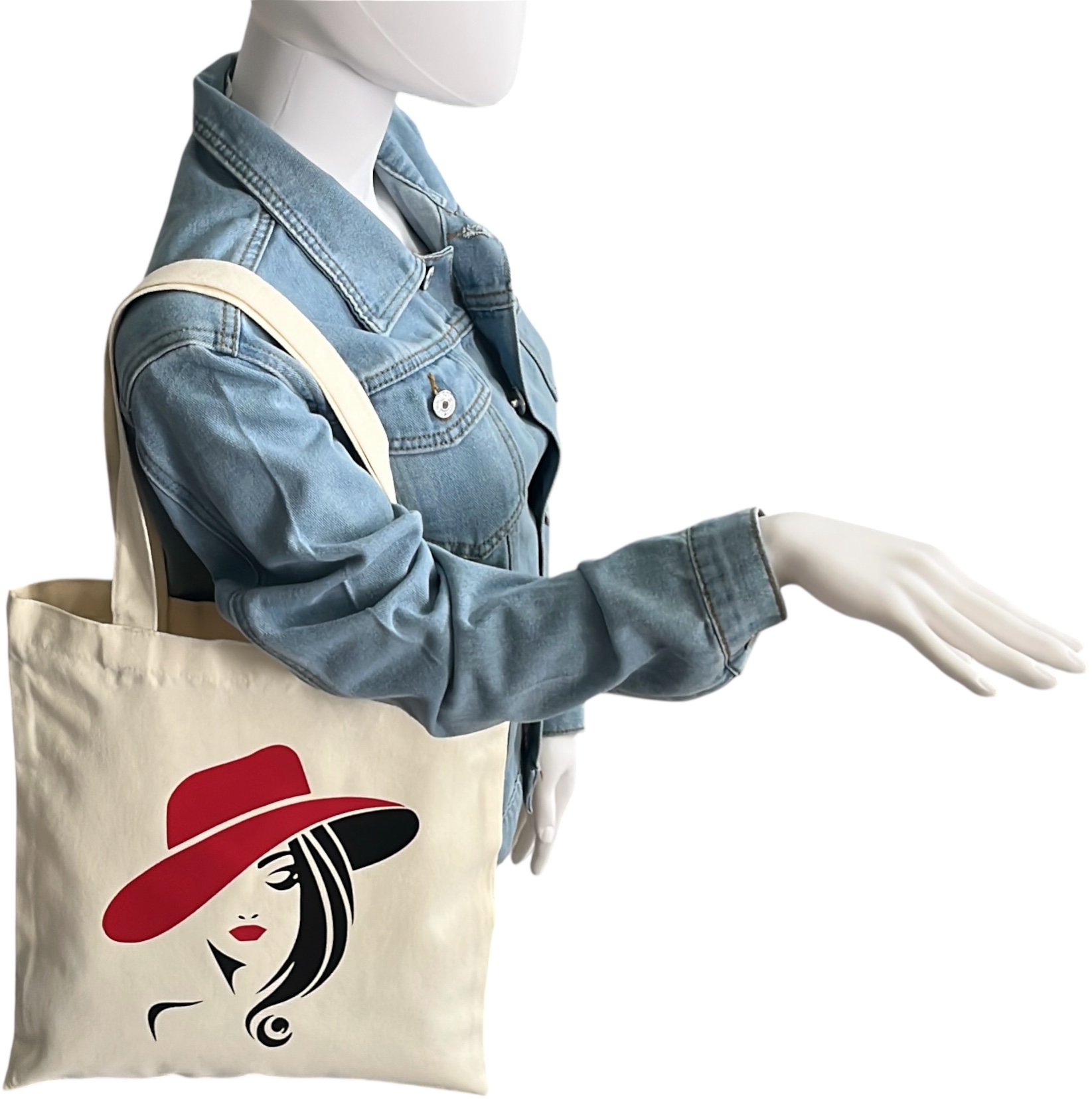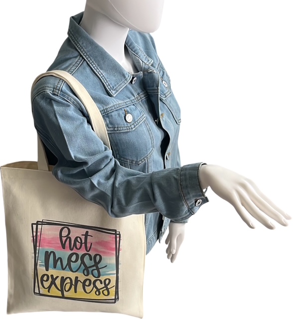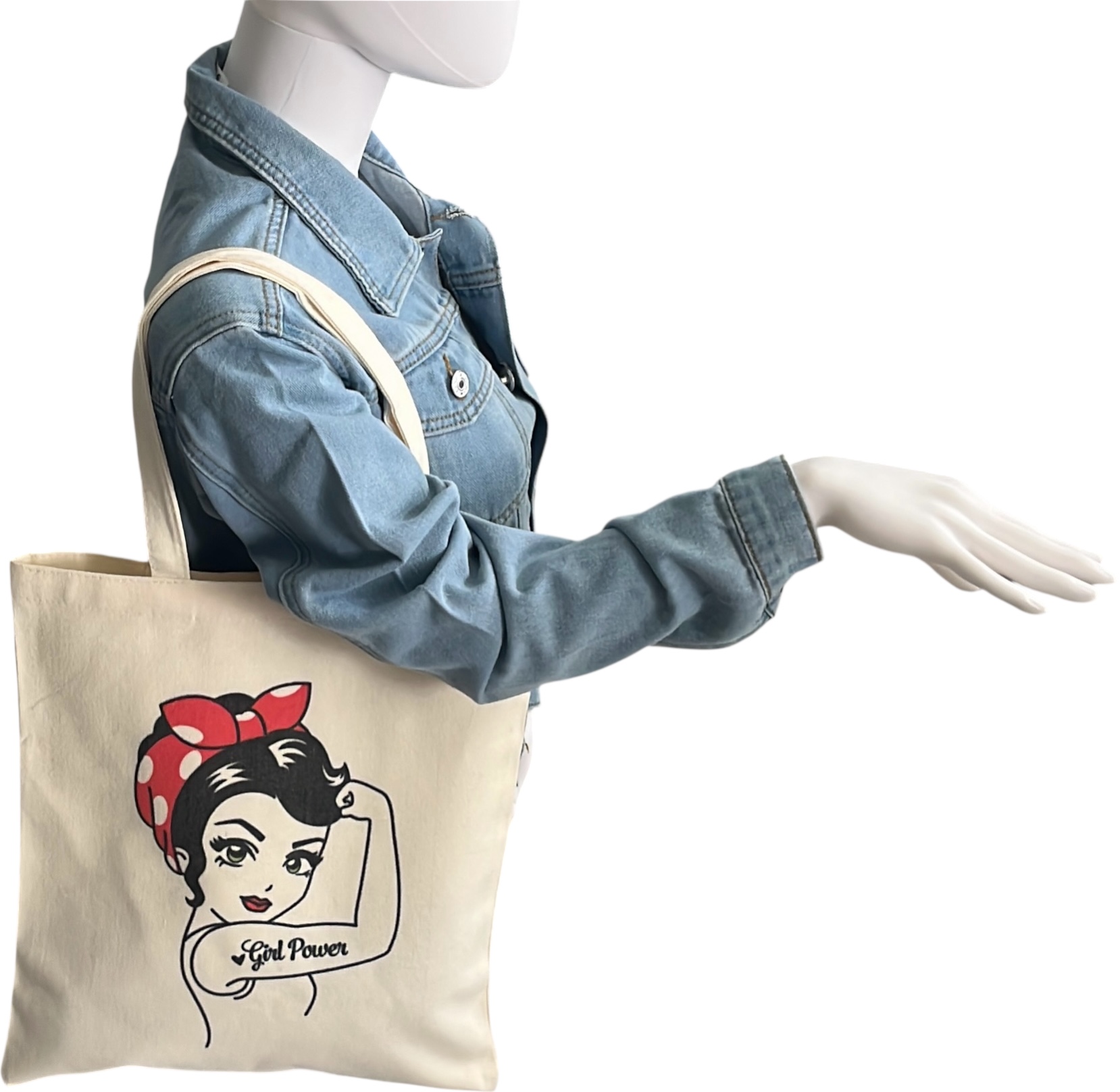100% cotton 15” w x 16”H, handles are long enough to be carried by hand and over the shoulder. For longevity of design, hand wash inside out.
