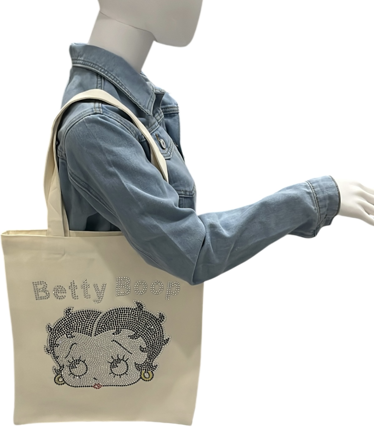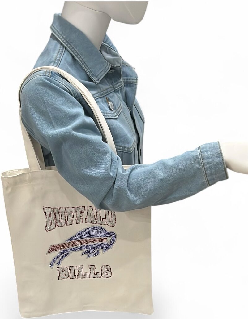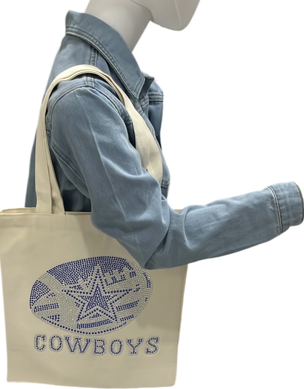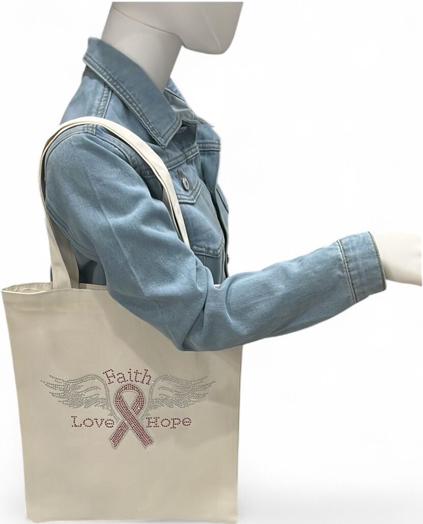 100% cotton 15” w x 16”H, handles are long enough to be carried by hand and over the shoulder. For longevity of design, hand wash inside out.