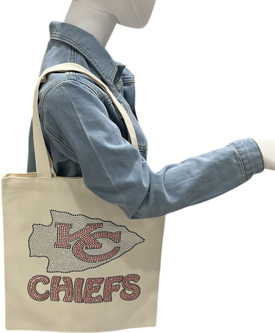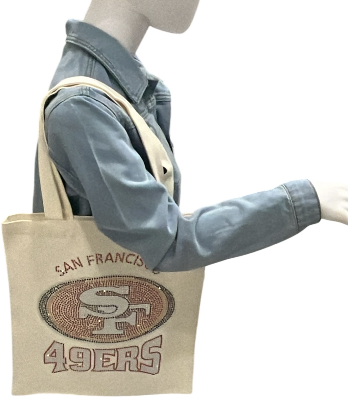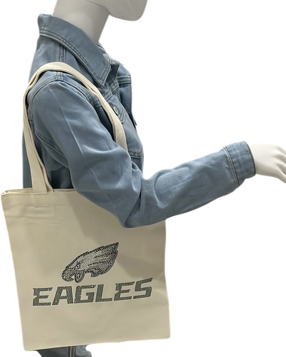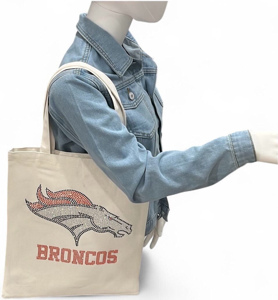 100% cotton 15” w x 16”H, handles are long enough to be carried by hand and over the shoulder. For longevity of design, hand wash inside out.