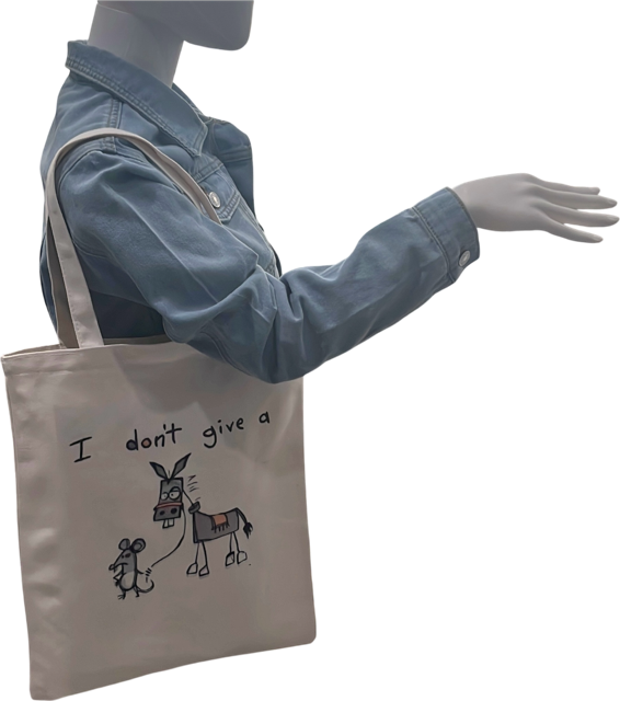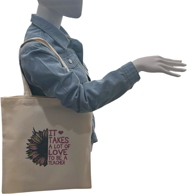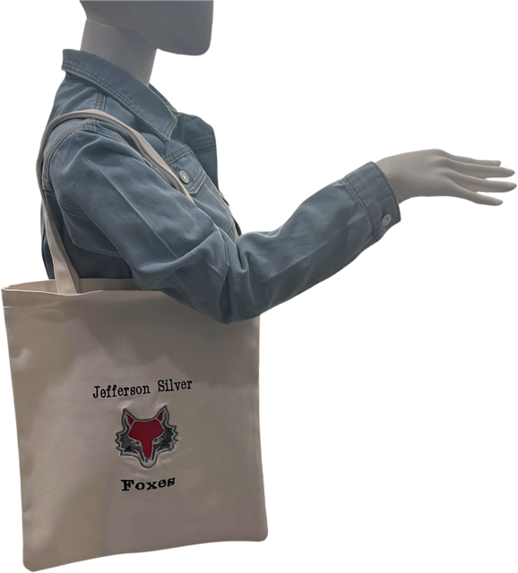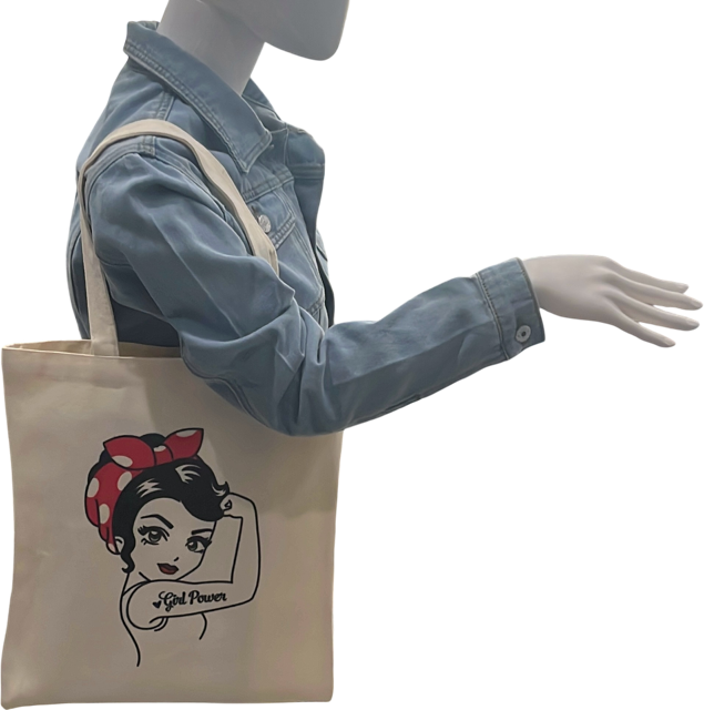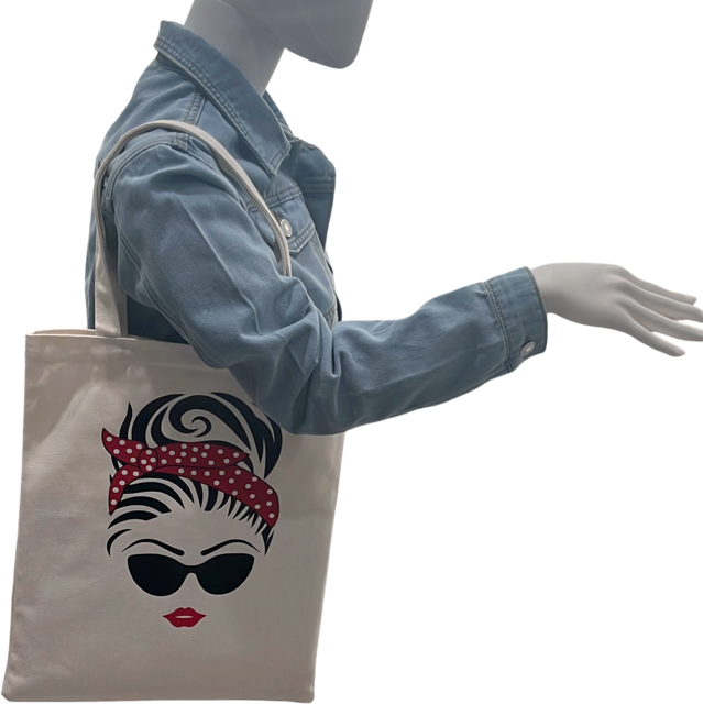 100% cotton 15” w x 16”H, handles are long enough to be carried by hand and over the shoulder. For longevity of design, hand wash inside out.